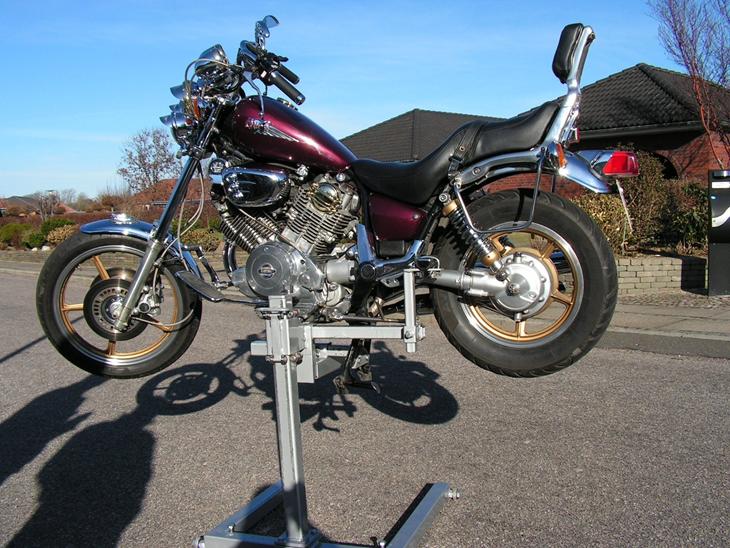 Jeg har fremstillet en MC-Lift, som kan skilles ad, og lægges væk, fylder ikke meget. Løfter hele cyklen i central støtteben, med en støtte under motoren og evt ekstra støtte ved bagerste fodhviler. Kan monteres fra højre eller venster side. Kører på kuglelejer, så liften med cyklen på kan flyttes til siden