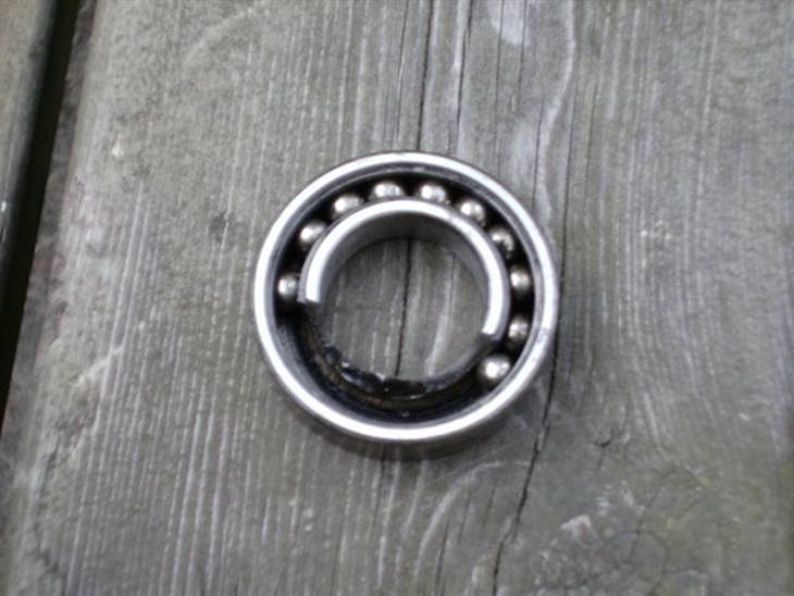 Her den 20.08.2008, fik jeg skiftet dæk på min Cagiva Raptor 650. Så kom mekanikeren med venstre forhjulsleje. Den inderste ring var knækket af! De havde ikke set noget lignende, jeg er udlært finmekaniker og har heller ikke set noget lignende.