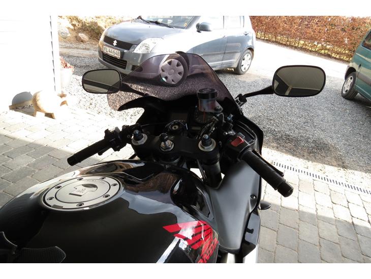 Få milimeter gør at styret kan få fuldt udslag, i og med det lige præcis kan bevæge sig hen over kåben. Optimalt snittede man nok lige et hjørne af kåben og tilpasset kåbeglasset, det ville også give bedre plads til grebene. Kåbeglaset er jeg ikke øm over for men jeg ville have det skidt med at ødelægge kåben. Det holder jeg mig fra.