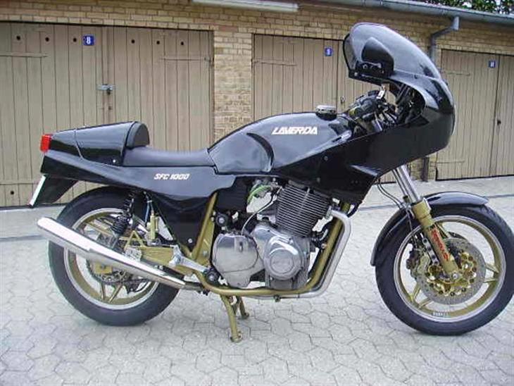 Laverda SFC 1000, det er den sidste 3 cyl , fabrikken lavet, motoren er med 120grader"s krumtap, motoren er gummiophængt. Det er kun fremstillet ca 500 stk, fra 1985-89, min er med egerhjul, lavet til det tyske market.Jeg har her i foråret monteret original fælge " Oscam" så nu står cyklen i perfekt stand