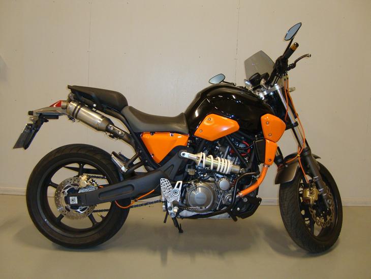 Større bremseskive for, mindre tandhjul for bedre bundretræk, lille vindskærm for, styrtbøjle, motor/bundbeskytter, diverse slanger, hætter og tændrør.