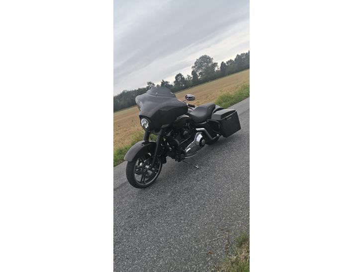 Den blev købt i 2017 helt original med 30.000 km på tælleren... Den har stået i Frankrig og været bandidospræsidentens kværn når han var i Frankrig... Den havde lige nøjagtig fået lavet komplet stage 2 Kit da jeg overtog den... Begyndte adskillelse med det samme og fik bestilt Bagger Kit hjem fra USA og mange andre dele... Den blev skilt helt ad og samlet igen på godt 1.5 mdr og det var mit første Mc projekt, så Sys selv jeg slap godt fra det... Da kittet kom hjem var pasformen ad helvedes til, så både kasser og skærm blev der skåret i og lavet om og tilpasset så det bare sad lige i skabet... Der er taget mange dele fra den nyere udgave af street glide og alt anlæg er også optimeret med større højtalere og flip out skærm...