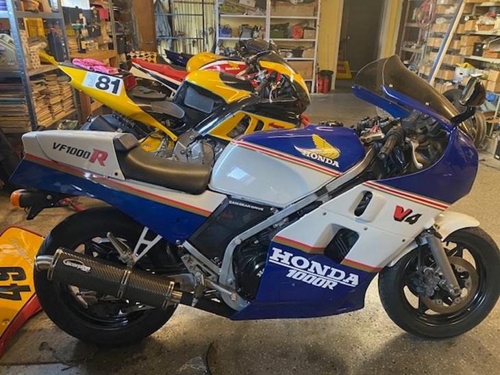 Honda VF1000R i Rothmans farver. Nyt bagdæk, nyt kædekit, nye bremser foran, instrumenter skiftet, ukendt km tal. Kører fint og starter med det samme, ingen mislyde, evt. nysynet. Flot stand. Absolut Liebhaver cykel.