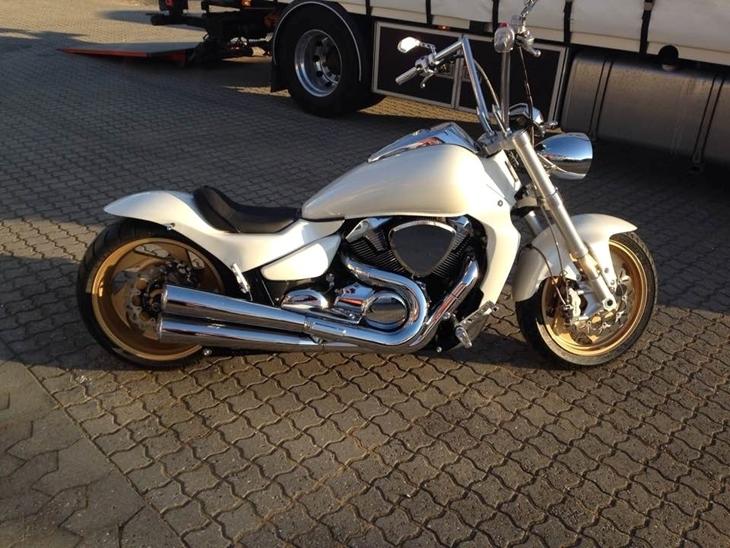 Suzuki Intruder årg 2007 M1800r , VZR 1800 km 33000km 125HK i hvid perlemor , thunderbike dele , b.l.a bagende og udstødninger den er bygget i egostil sænket 3" med solosæde og apehanger og Bullitt forlygte . 280mm bagdæk evt bytte med en anden mc/ cruiser